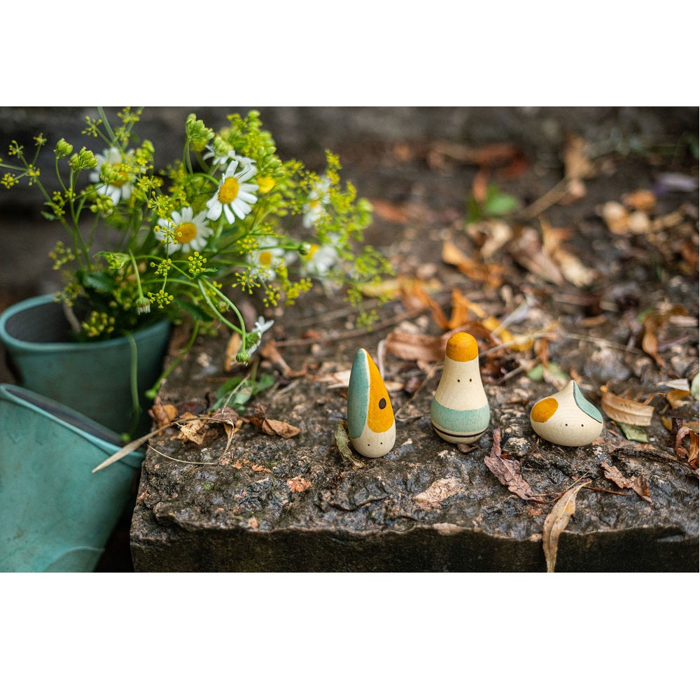 Wood HOORAY family of 3 each measuring approximately 37-65mm tall and approximately 28-39mm tall.